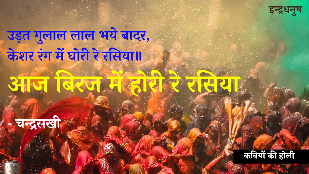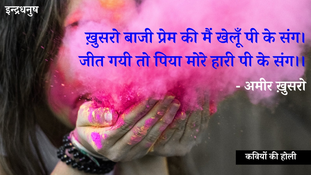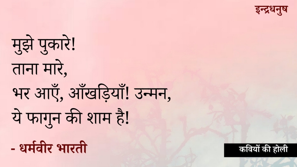 इंद्रधनुष के पाठकों के लिए इन रचनाओं का चयन ‘हिंदी-कविता’, ‘कविता-कोश’ और इंटरनेट के भिन्न-भिन्न वेब-पतों से से साभार यहाँ प्रस्तुत किया गया है। होली की शुभकामनाओं के साथ, हम आशा करते हैं कि पाठक इस चयनित रचना-पाठ से साहित्य में होली की अभिव्यक्ति से परिचित होंगे, एक पुनर्पाठ प्राप्त कर सकेंगे, कवियों की नज़र से फागुन को देख सकेंगे, महसूस कर सकेंगे।– सं.